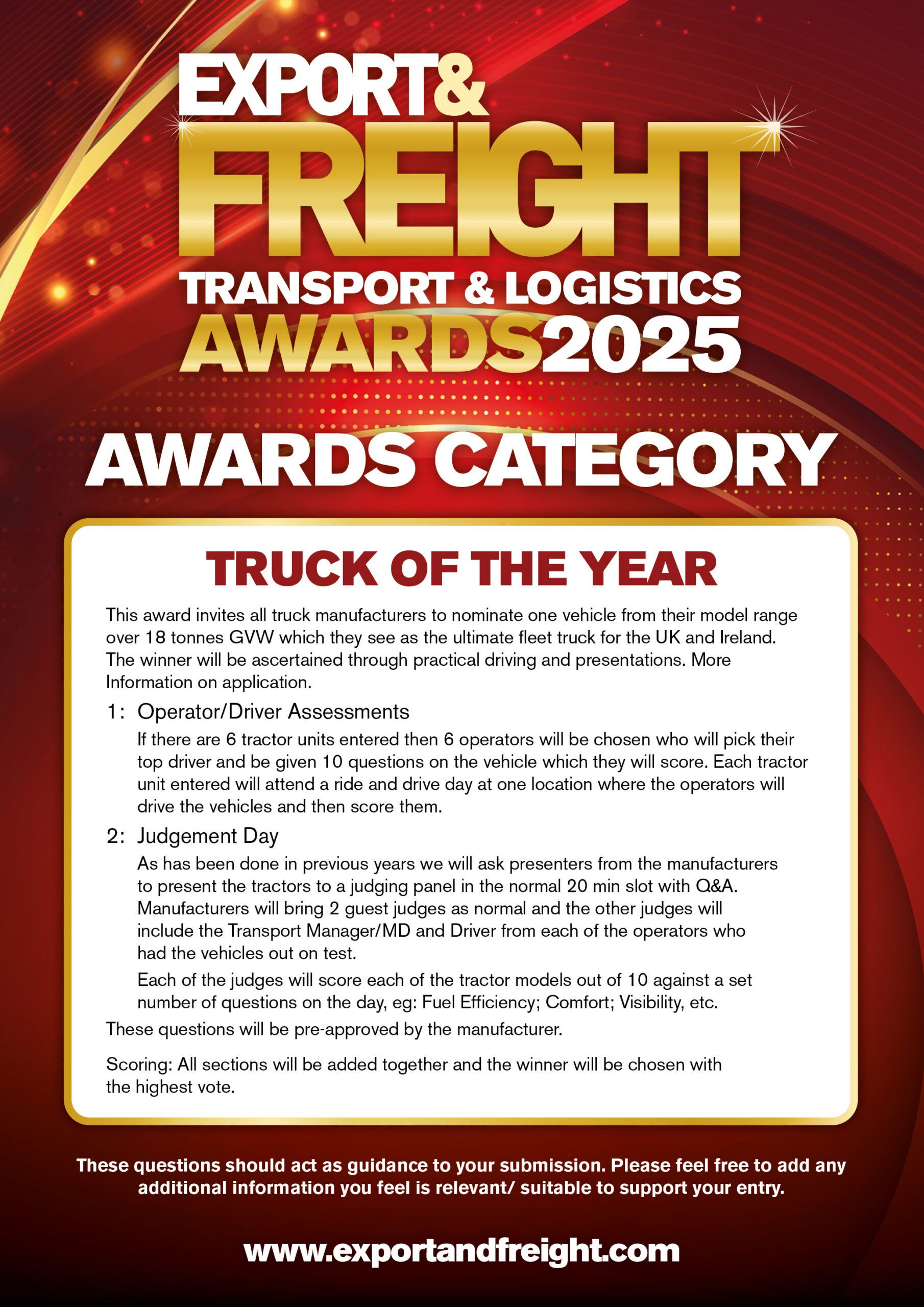 This award invites all truck manufacturers to nominate one vehicle from their model range over 18 tonnes GVW which they see as the ultimate fleet truck for the UK and Ireland. The winner will be ascertained through a practical driving test and presentations.