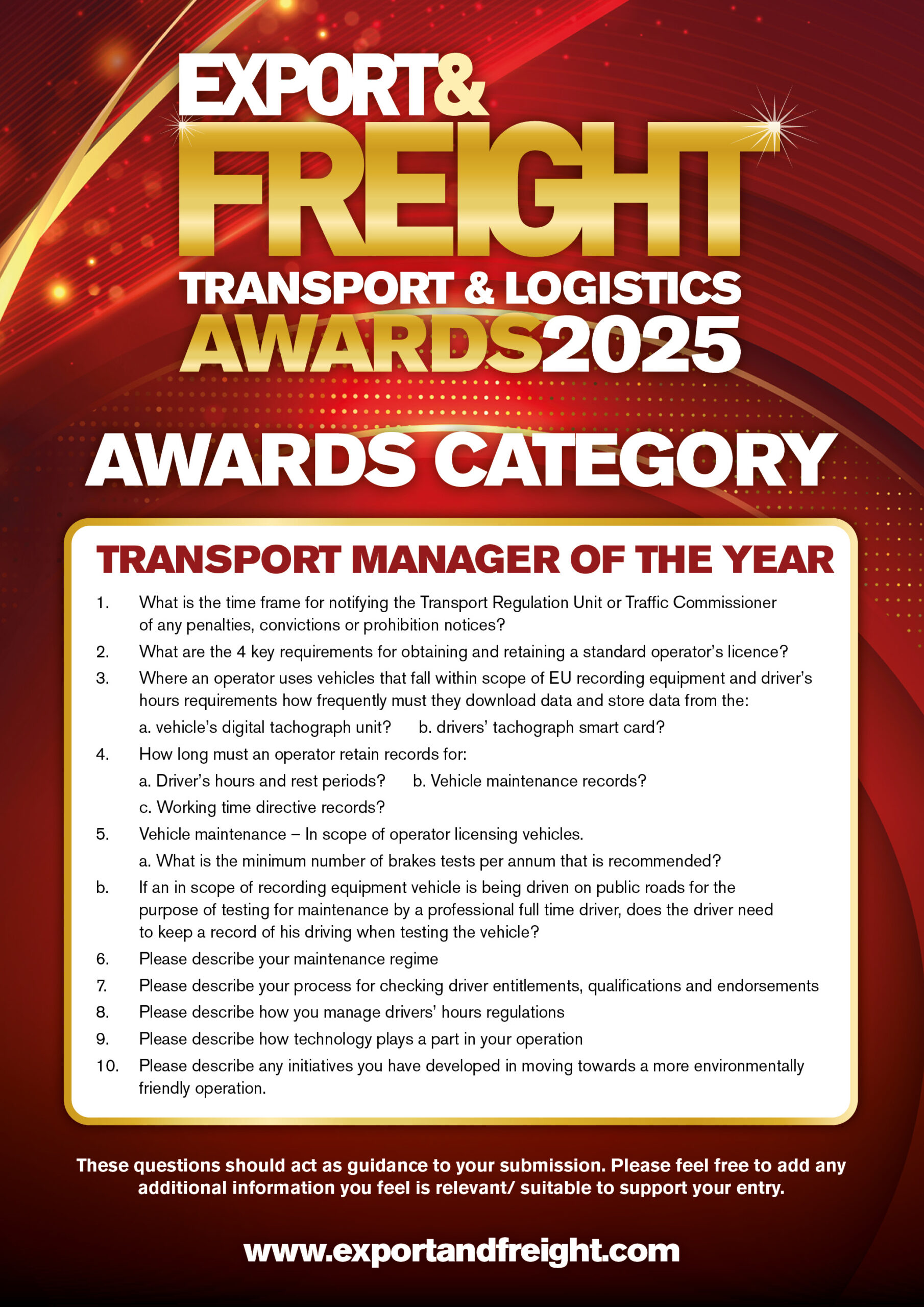 This award will be presented to the applicant who demonstrates the highest levels of up-to-date knowledge, professionalism and ability in managing all aspects of a modern transport undertaking. The judging process will include a face to face interview.