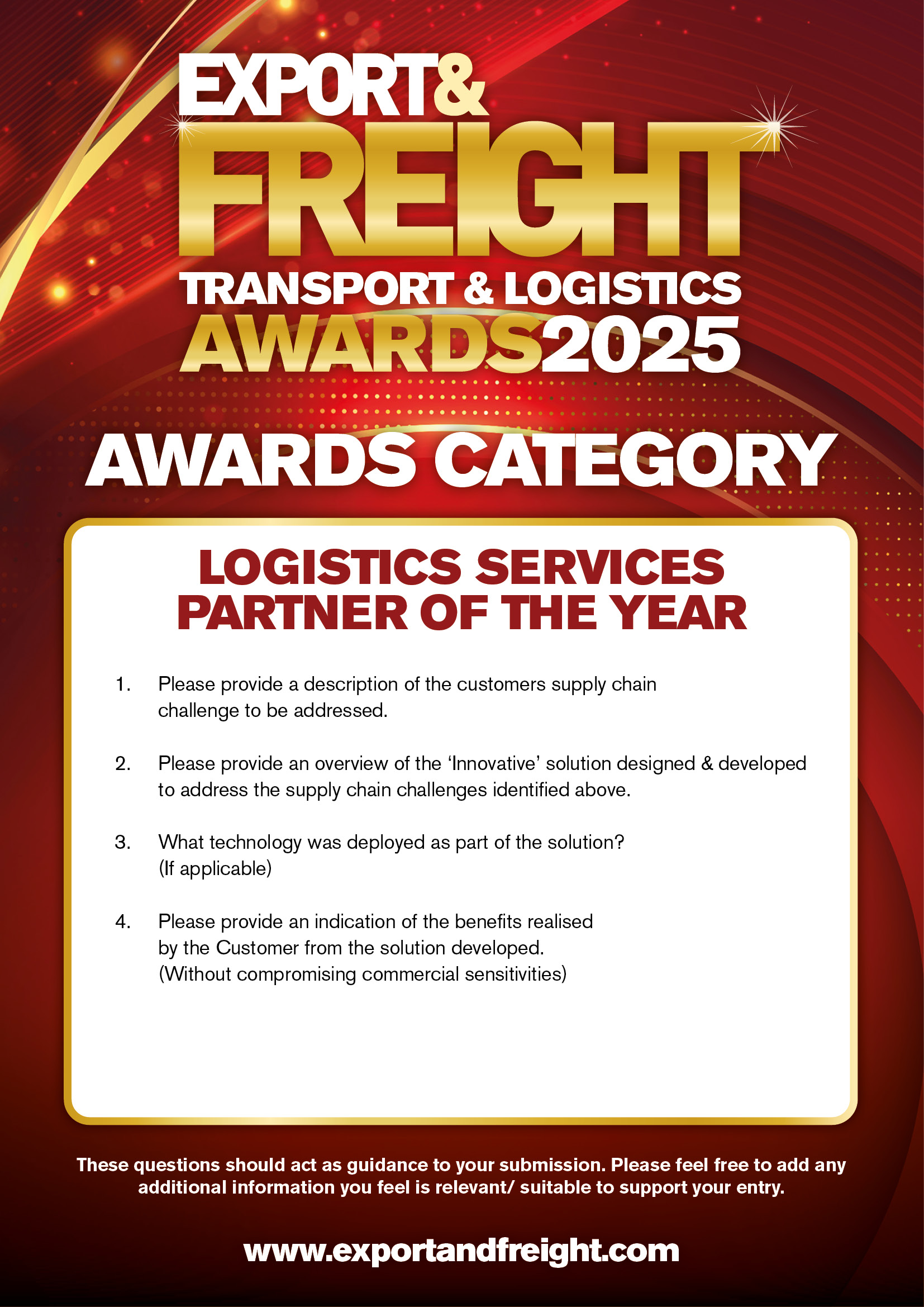 2025 brings unprecedented challenges and opportunities for supply chains across the world. Following feedback received on the introduction of the new Supply Chain of the Future Awards we have decided to rename this award and revise the criteria to provide a greater focus on the ‘Logistics Services’ elements of the Supply Chain.