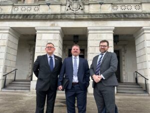 RHA’s new Policy Lead for Trade and Borders, Alastair Gunn joined Martin Reid (RHA), Mark Tait (Target Transport) and Ally Hobson (Montgomery Group) at Stormont last week. They were invited to give evidence to the NI Economy Committee about issues when moving goods from GB to NI. Following their appearance before the committee Martin and Alastair met with a few members to celebrate National Lorry Week. Thanks to Brian Beattie at McCulla Transport, Fiona Derry at Derry Group Ireland and Geoff Potter of Gray and Adams for supporting National Lorry Week.